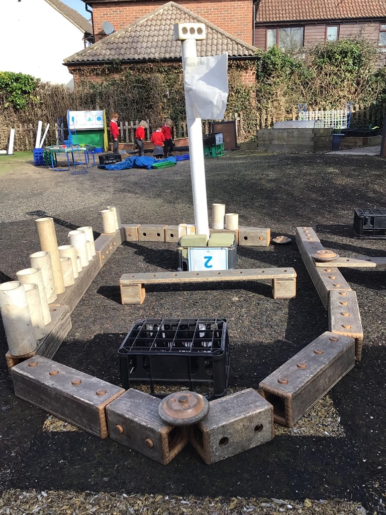 We are reading a book called “Never mess with a pirate princess”. Our challenge this week is to make a pirate ship in the garden. This is our ship. We have a flag and a plank to walk.