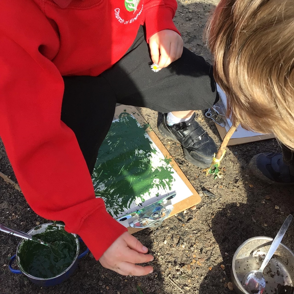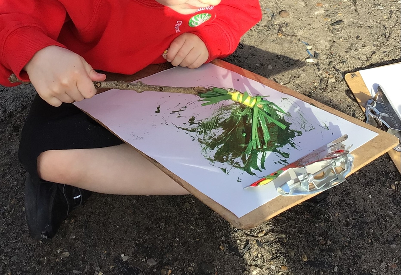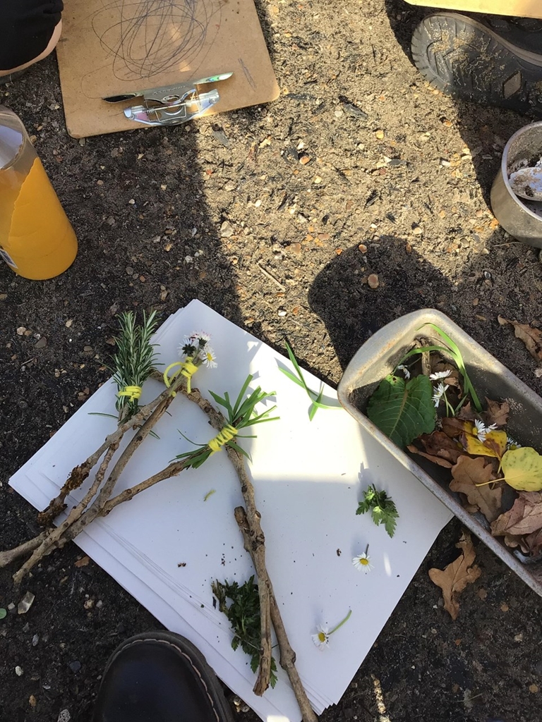 My natural paintbrush is made from grass. Mine is made from rosemary. We used grass, rosemary and daisies. We like the rosemary best because they smell nice. We collected some things from the field. We saw a spider and a butterfly but you don’t usually see those in February. We rescued a ladybird this morning and put it in the bug hotel. We made camouflage colours with our paint.